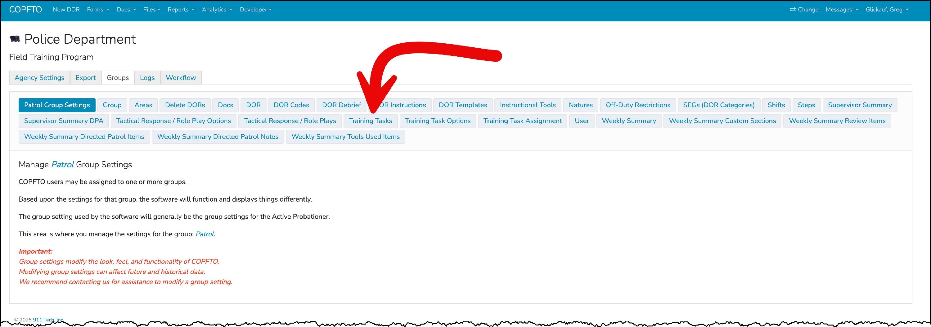 YOUR NAME => AGENCY SETTINGS => GROUPS => MANAGE [group name] => Training Tasks